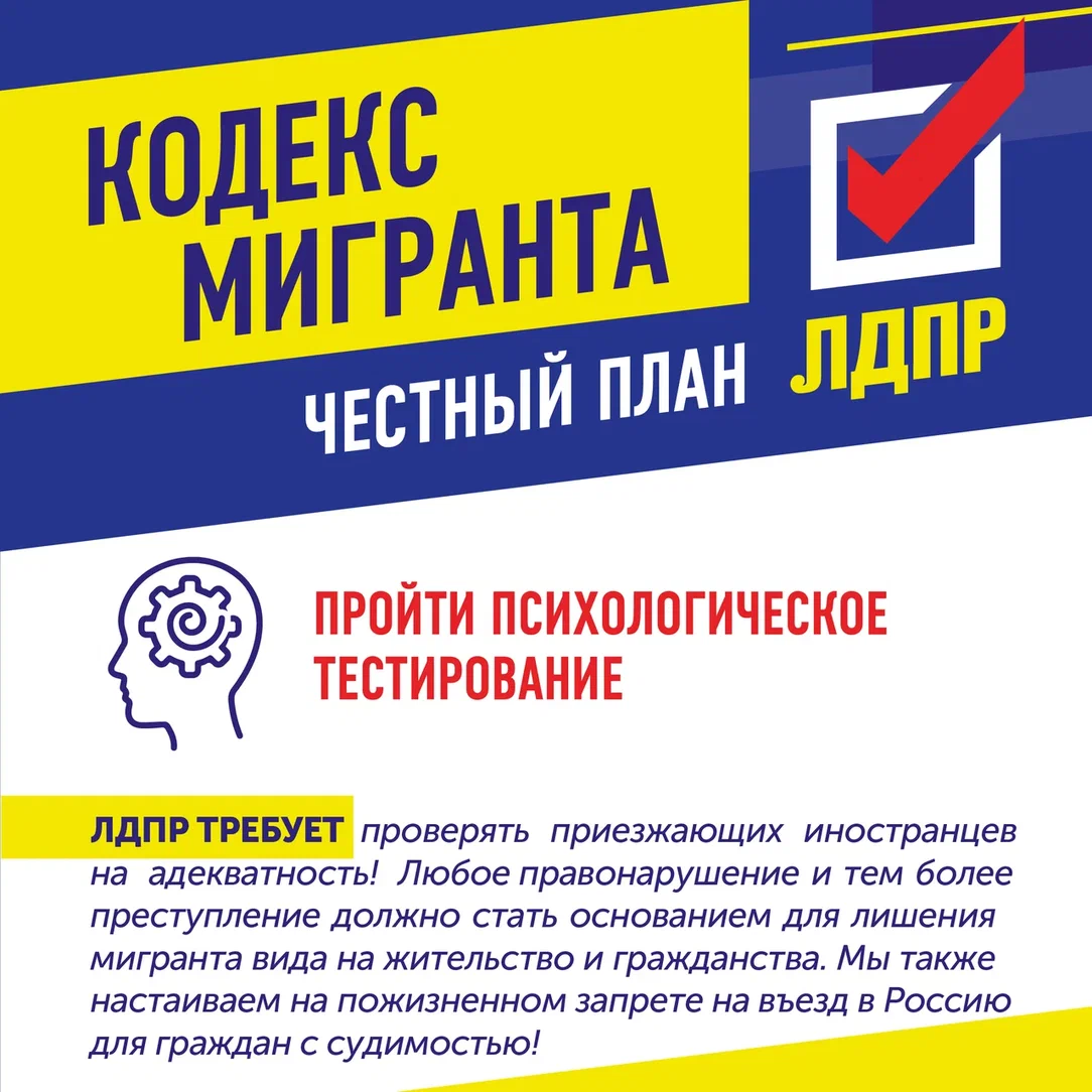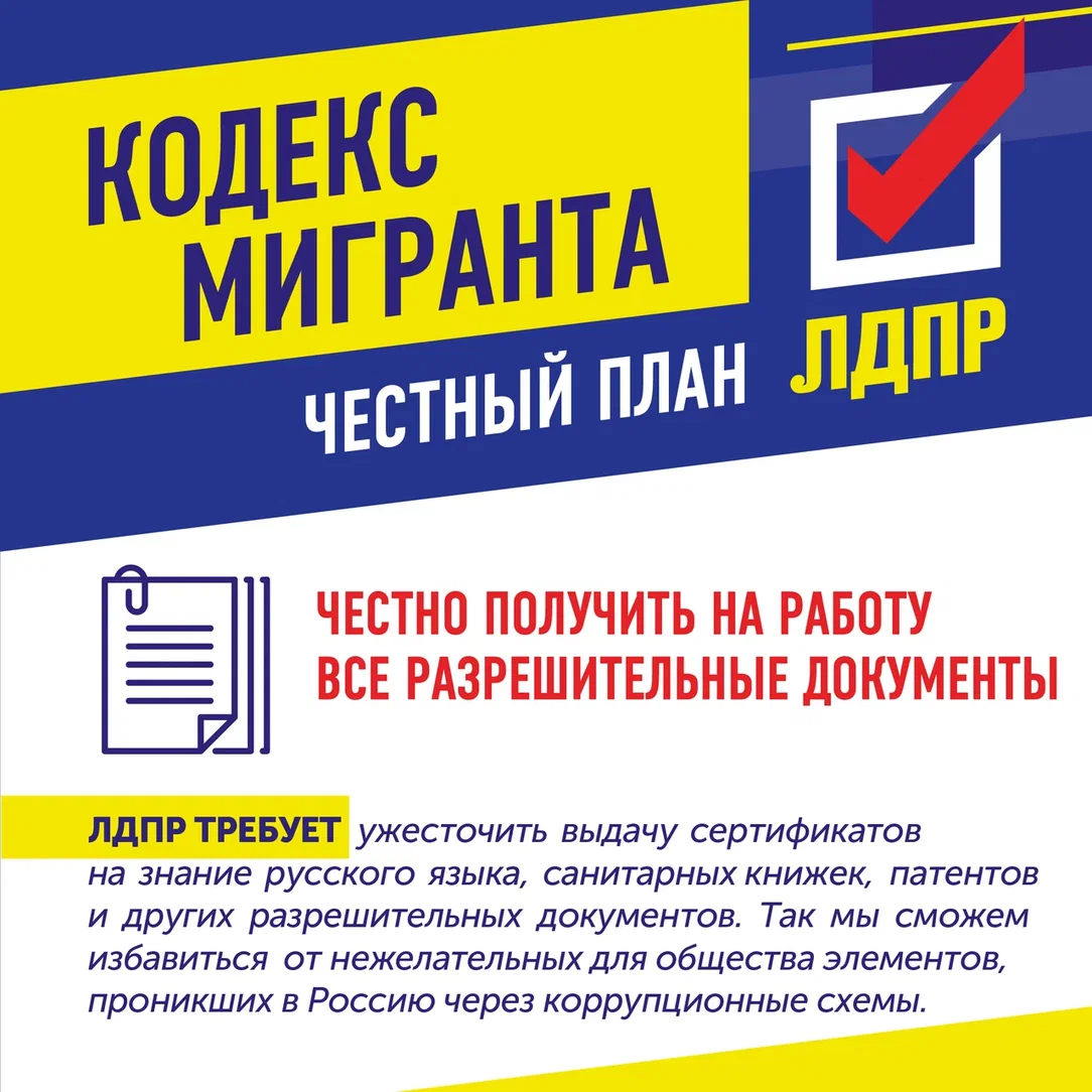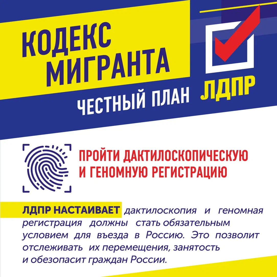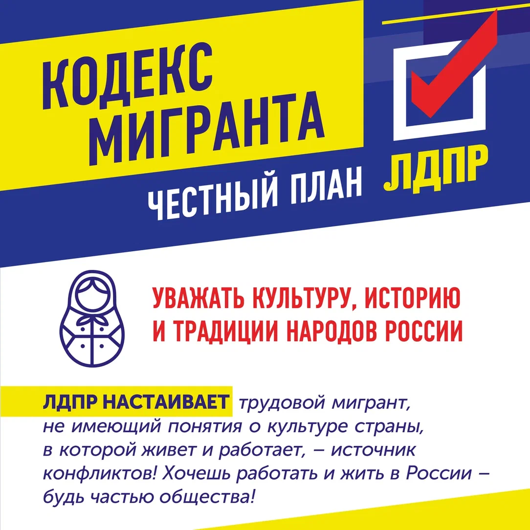Для решения проблемы ЛДПР разработала «Кодекс мигранта» — обязательный набор правил поведения для приезжих! В его основу легли законодательные инициативы партии, которые созданы, исходя из пожеланий жителей. Мы продолжаем выступать за ужесточение миграционной политики, чтобы обезопасить наших граждан.