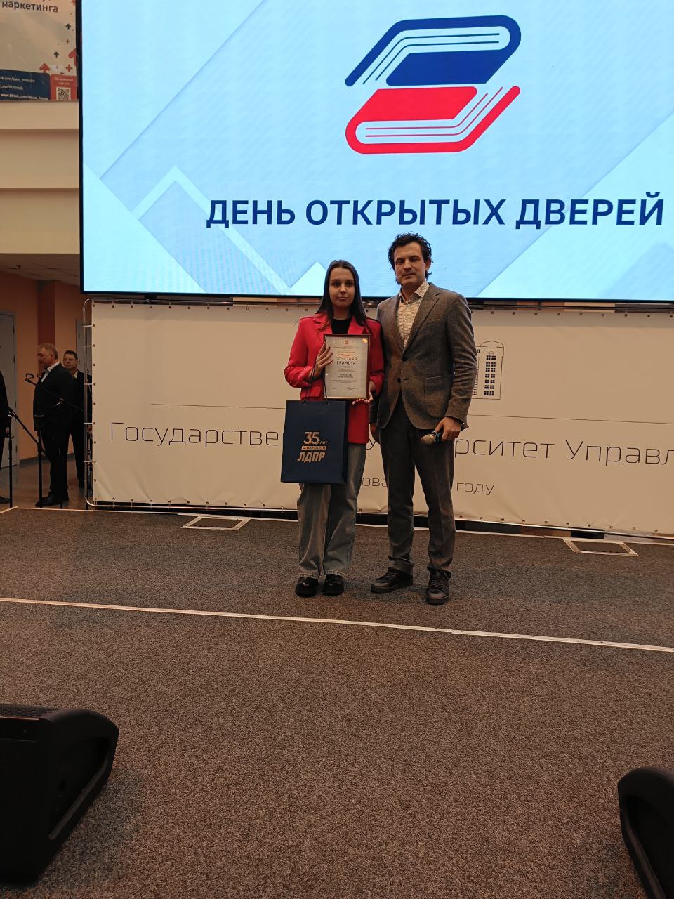 От лица депутата ГД Дмитрия Свищева координатор МГО ЛДПР Роман Крастелев поздравил ребят с Татьяниным днем, а также вручил Почётную грамоту "за развитие студенческого самоуправления и сохранения традиционных духовно- нравственных ценностей среди молодёжи " руководителя патриотического направления студенческого совета института заочного образования ГУУ на встрече с абитуриентами на дне открытых дверей.