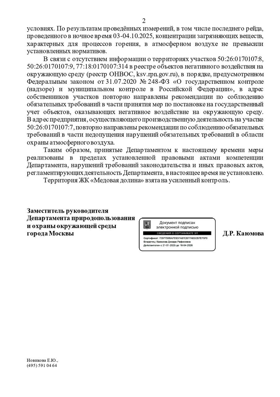 В результате оперативного реагирования и межведомственного взаимодействия, Департамент природопользования и охраны окружающей среды провел серию внеочередных выездов на территорию промышленной зоны и прилегающие участки. В ходе проведенных проверок нарушений экологического законодательства выявлено не было.