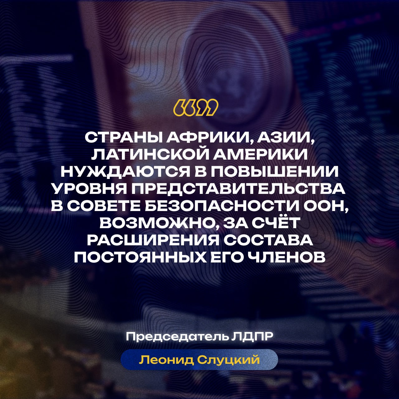 В то же время Слуцкий отметил необходимость реформирования ООН, поскольку существующий баланс сил в мире кардинально изменился за последние 80 лет. Он считает, что страны Африки, Азии и Латинской Америки нуждаются в большем представительстве в Совете Безопасности ООН.