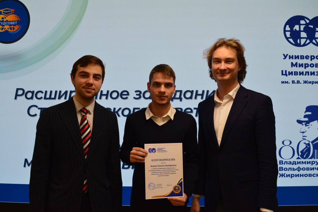 В рамках мероприятия были также отмечены студенты, проявившие себя в различных направлениях общественной деятельности. Активисты Даниил, Алексей и Илья были удостоены грамот за их вклад в развитие студенческого самоуправления и активное участие в жизни университета.